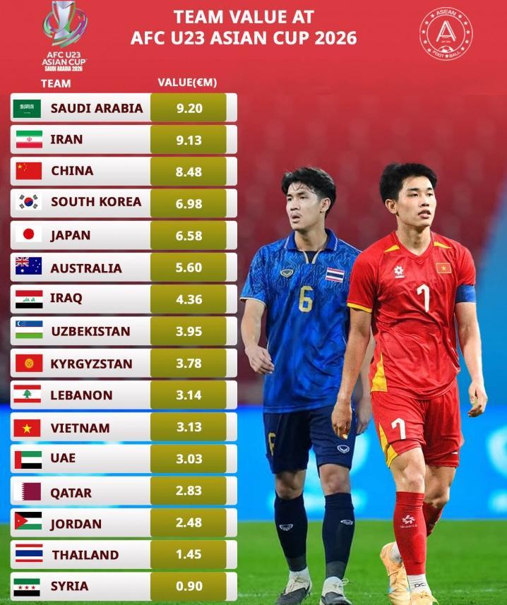 由于本届U23亚洲杯并不是在国际比赛日进行,而且最终的比赛结果,也不会和奥运会名额挂钩,所以多支参赛球队,都没有选择征召留洋球员,这就导致他们的全队总身价出现了暴跌。根据比较权威的身价网站《德国转会市场》的统计,此次参加U23亚洲杯正赛的16支球队,身价都没有突破1000万欧元这个大关。排名第一的球队,是东道主沙特。他们全队身价仅为920万欧元,其中队内头号球星朱维尔一个人,就占了400万欧元。