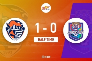 伤停补时8分钟。上半场比赛结束,青岛海牛1-0天津津门虎。