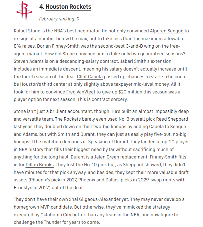 露天看台则将杜兰特+申京+阿门的三人组列为联盟第四强组合,认为杜兰特的加入极大提升了火箭的战术可能性。