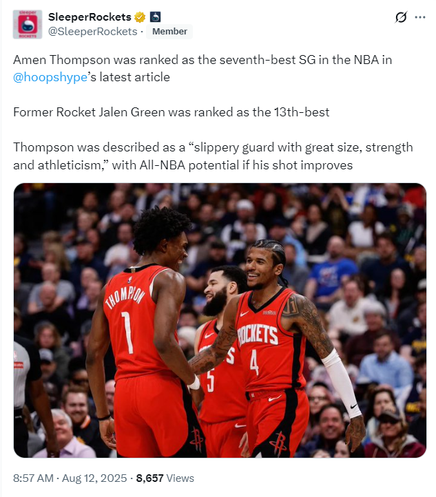 据HoopsHype预测,改打得分后卫的阿门将在25-26赛季迎来爆发,预计位列联盟SG第七位,而离队的杰伦·格林仅排第13。这印证了斯通的交易不仅获得杜兰特,更促进了年轻球员的成长。